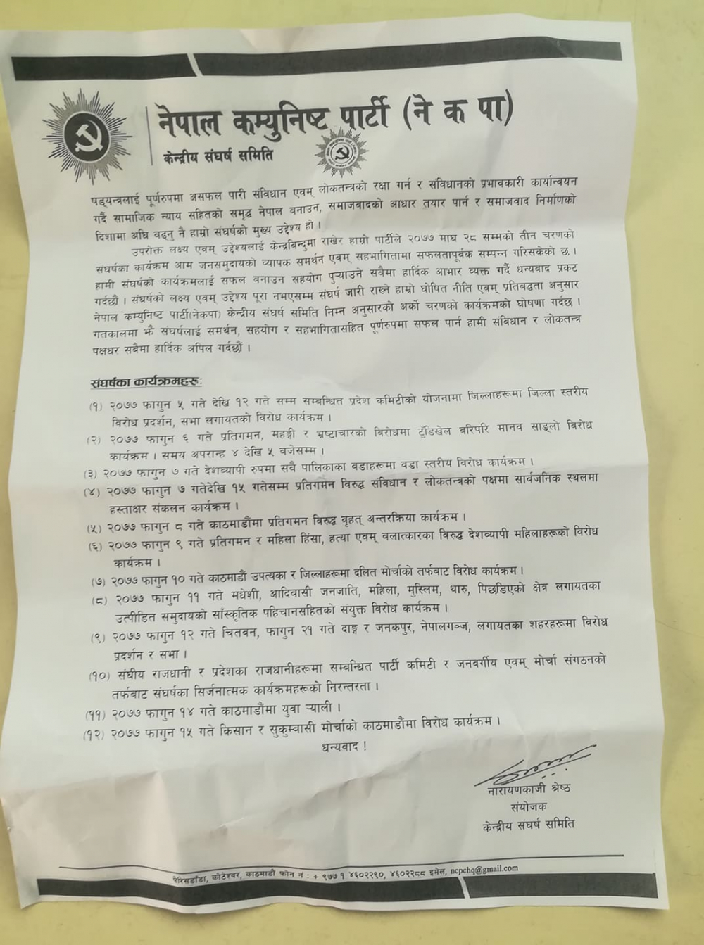 फागुन ९ गते प्रतिगमन, महिला हिंसा, हत्या एवम् बलात्कारका विरुद्ध देशव्यापी महिलाहरुको विरोध, फागुन १० गते काठमाडौं उपत्यका र जिल्लाहरुमा दलित मोर्चाको तर्फबाट विरोध, फागुन ११ गते मधेशी, आदिवासी, जनजाति, महिला, मुस्लिम, थारु, पिछडिएको क्षेत्रलगायतका उत्पीडित समुदायको सांस्कृतिक पहिचानसहितको संयुक्त विरोध गर्ने भएको छ ।