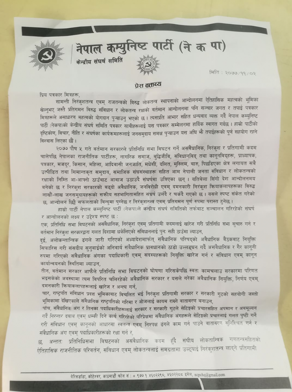 काठमाडौँ,२ फागुन । नेकपा दाहाल–नेपाल समूहले चौथो चरणको आन्दोलनका कार्यक्रम घोषणा गरेको छ ।केन्द्रीय संघर्ष समितिले आइतबार पार्टी कार्यालय पेरिसडाँडामा पत्रकार सम्मेलन गरी फागुन ५ देखि १५ गतेसम्म आन्दोलनका कार्यक्रम घोषणा गरेको हो ।